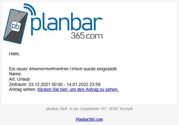 Über jeden neuen Abwesenheitsantrag erhältst du zusätzlich eine Mail. Diese enthält einen Link der direkt zu den Anträgen führt.